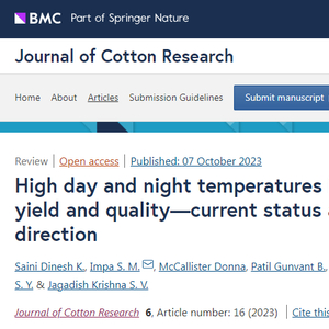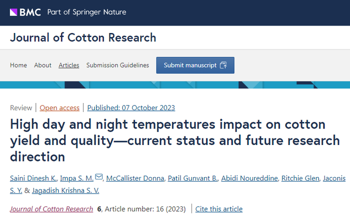 近日,美国Texas Tech University的IMPA S. M.等在Journal of Cotton Research在线发表了题为“High day and night temperatures impact on cotton yield and quality—current status and future research direction”(昼夜高温对棉花产量和纤维品质影响的研究现状及展望)的综述文章。