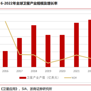 全球卫星产业规模保持稳定增长, 根据SIA数据,2022年全球卫星产业收入2810亿美元,比2021年增长了20亿美元。从结构上看,卫星服务业和地面设备制造业占据主要价值量环节,二者 占比卫星产业价值量90%+。