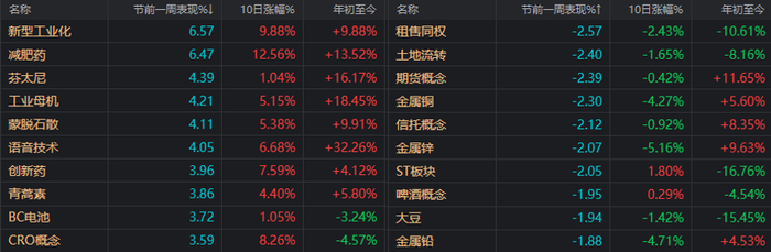 体现到板块上,则是新型工业化与减肥药为首的医药股两大板块在领涨;部分地产细分板块、多种金属和ST板块领跌。
