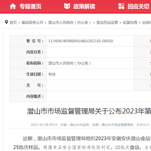 中国质量新闻网讯 2023年10月8日,安徽省潜山市人民政府网站发布潜山市市场监督管理局关于公布2023年第29期食品监督抽检信息的通告。