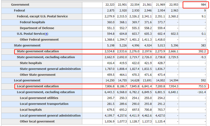 翻看具体的政府部门岗位变动,就可以很明显的看到,联邦和地方政府的教育员工在9月暴增了38.3万和75.3万,而其他政府员工,也就是所谓的公务员,在9月合计减少了17万人。