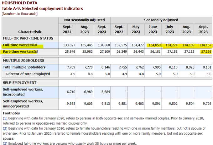 那么实际数据是多少呢?翻看家庭调查后我们发现兼职员工的季调数据在9月增加了12.3万,达到815.1万,创下了2020年1月以来的最高水平。至于未经调整的数字,则从777.8万飙升到814.6万,增加了36.8万,甚至更多高于机构调查报告美国劳工部宣传的33.6万非农就业人数,也就是说,美国就业一片大好的背后,是那些失去全职工作的人转向兼职和已经打工族们开启兼职人生的结果。