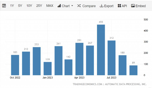 10月4日,有着"小非农"称号的ADP就业数据显示,美国9月ADP就业人数录得增加8.9万人,为2021年1月以来最小增幅,不仅低于上个月的17.7万人,也低于市场预期的15.3万人。