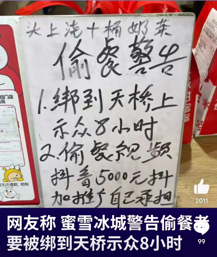 偷餐者要被绑到天桥上示众8小时、头上浇十桶奶茶、偷餐视频还会被发布在网上?据东方网报道,近日,广东广州蜜雪冰城某门店手写的偷餐警告引发网络热议。该门店随后回应称,由于平时被偷的太多,没有办法,只好写得严重一点吓唬吓唬那些小偷,没有真的实行过。