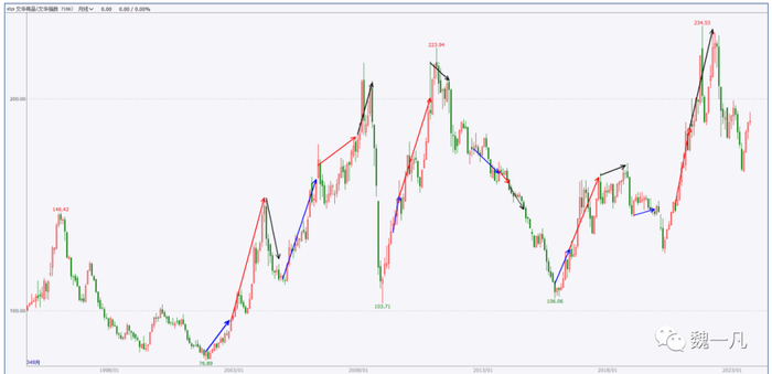 大宗商品存在了不同级别周期的嵌套,当大小周期共振向上时,商品上涨的幅度和时间会比较大。