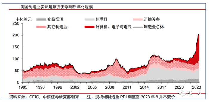 2023年,我们看到美国的通胀率与制造业建筑投资再度向上运行,尤其是美国计算机与电子、电气类投资大幅上行。