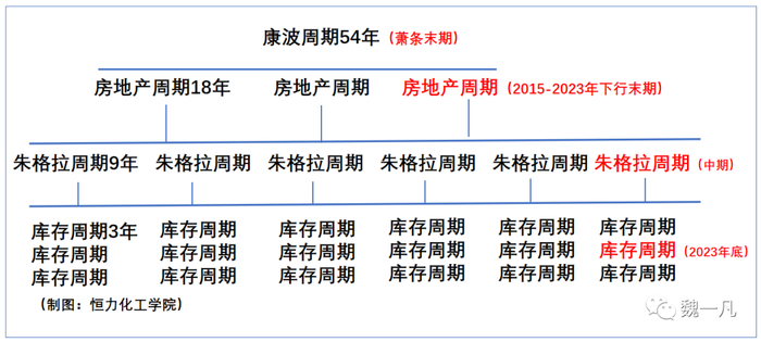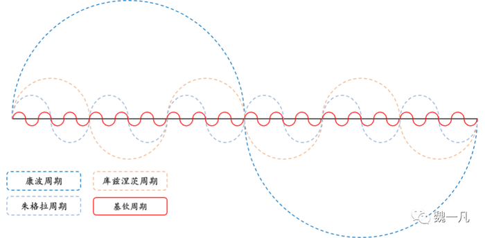 这是某券商整理的一个经济周期重叠图,有时候是大小经济周期同向共振,有时候是反向关系。