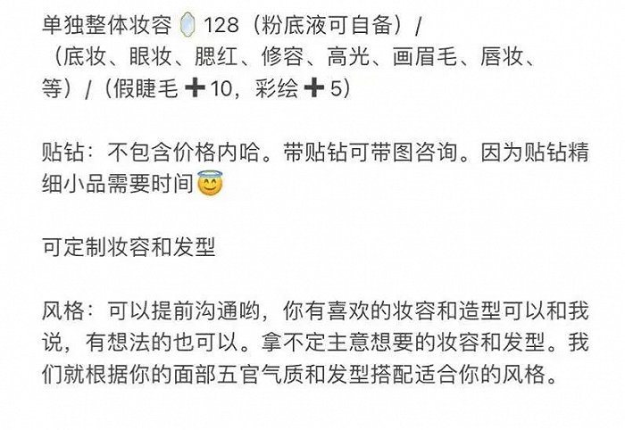 “全妆+编发118元,预约送丝带和星星发夹。”这是兼职化妆师何星给出的报价,如果有妆容定制需求,按化妆时间和妆面、头型复杂程度等再往上加钱。