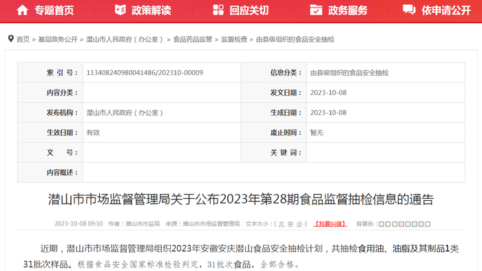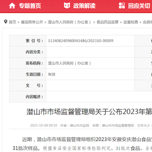 中国质量新闻网讯 2023年10月8日,安徽省潜山市人民政府网站发布潜山市市场监督管理局关于公布2023年第28期食品监督抽检信息的通告。