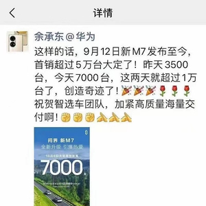 十一长假最后一天,履新华为智能汽车解决方案BU董事长的余承东,在朋友圈发布新款问界M7销量战报:10月6日,新款问界M7大定(交了定金、购车意向极高的订单)达到7000辆,10月5日为3500辆,假期最后两天大定量超过1万辆。