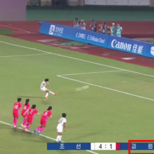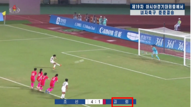 图为朝鲜中央电视台10月2日播出上月30日进行的杭州第19届亚运会女子足球1/4赛朝韩对决的相关报道。报道画面中,该朝鲜媒体将韩国标作“傀儡”队。图源:韩媒
