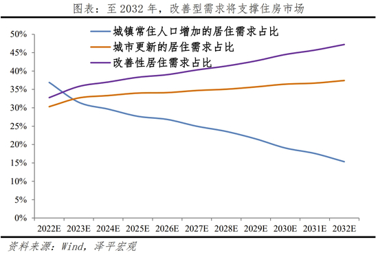 4)城镇化尚有一定空间,转向改善型需求为主。根据我们测算,2023-2032年年均新增城镇居住需求约10.9亿平,城镇常住人口增加(剔除行政区划变动,后同)、居住条件改善、城市更新需求分别占总需求的31.5%、32.7%、35.8%。改善性需求总量、占比均呈现逐年增长趋势。