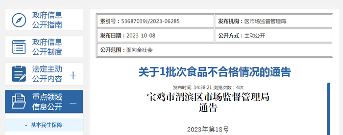 陕西省宝鸡市渭滨区市场监管局关于1批次食品不合格情况的通告(2023年第18号)