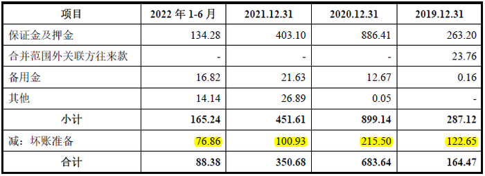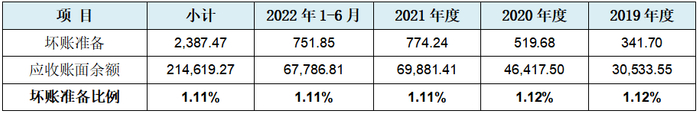 从上表我们通过简单计算就可以知道,发行人2019年-2022年6月末其他应收款计提坏账准备的比例以此为:42.72%、23.97%、22.35%、46.51%,平均值约为28.61%。发行人尚且知道其他应收款都要计提28.61%的坏账准备,反观发行人为何在应收账款上只计提了1.11%的计提坏账准备?一个把钱给人家要人家还钱,一个把货给人家问人家要钱,哪个法律关系简单,哪个风险大不是一目了然的事么,发行人为何却要在应收坏备上选择性装聋作哑?