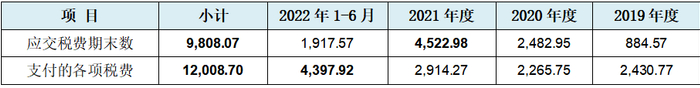 从上表中我们首先就看到一个大漏洞,上表中2021年末应交税费为4,522.98万元,可是上表中的2022年1-6月支付的各项税费仅为4,397.92万元。交的税没有欠的税多?上年度的应交税费过了半年都没交齐,何况2022年1-6月支付的各项税费4,397.92万元还包了括2022年第一季度的企业所得税,1-5月的增值税和个税等。发行人这是向国家税务总局申请了延期交税了吗?还是实在没钱交选择躺平了任罚,要么就是数据乱编乱造,否则绝不会产生如此结果。