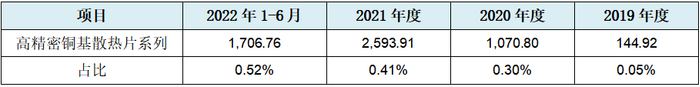 散热铜片业务是发行人三个主业中的最小业务,报告期内收入和占总营收比例见下表: