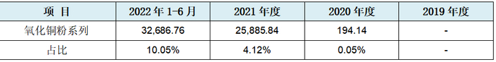 作为发行人承认的报告期内新增氧化铜粉业务,报告期内收入和占总营收比例见下表: