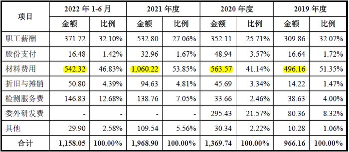 我们以上表中占比最高的标黄的材料费用为例,发行人报告期内的主业为铜球业务,我们基本可以确定上表中的材料费用是铜材料的消耗,发行人披露铜价平均价格(不含税)分别为4.20万元/吨、4.32万元/吨、6.07万元/吨和6.36万元/吨。我们据此可以推算出发行人报告期内研发领用的铜材料的重量依次为:118.13吨、130.46吨、173.67吨、85.43吨,合计耗用大约为507.69吨,如果折算为氧化铜粉相关的原料则只会更多。