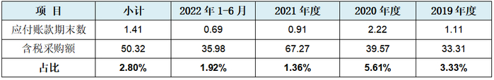 从上表我们可以看到,期初发行人的资产负债率接近80%为76.38%,可谓老婆婆。但在随后的期间内发行人的资产负债率每年降低10%左右,其10位数依次为7、6、5、4连续四期跨越四个十位数区间,不知道发行人是在经营企业还是在玩数字游戏,如此连续几乎等差降低的资产负债率是如何做到的(与发行人资产负债率有规律性降低对应的是发行人的资产总额,2019年-2021年之间的数值依次分别为:8.97亿元、13.29亿元、17.82亿元,也是几乎每年4亿元的等额增加。此外还有净资产该两个年度也是几乎以3亿元等额增加)。越来越低的资产负债率表面发行人的新衣服越来越新,同时也直接意味着发行人的负债越来越少,除了上文中说到的短期借款越来越高外,发行人能做到的就是保持应付账款及应付票据不能超额增长,最好是不要增长甚至下降。我们整理出发行人的应付账款期末余额与发行人当年度的材料采购金额比较情况,具体见下表:
