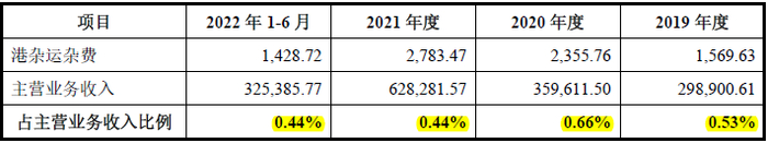 招股书中披露的发行人港杂运杂费也即运费占营业收入比例如下表: