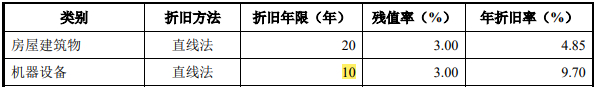 从上表中最后一列我们可以看到,发行人与铜球生产相关的主要设备成新率为74.85%-80.91%之间,机器非常新是不是?而发行人披露的固定资产折旧年限表中关于机器设备的折旧年限为10年,具体见下表: