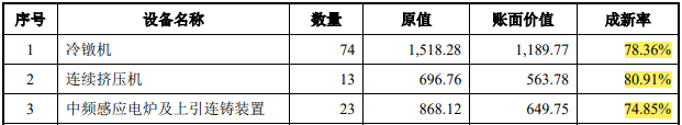 而发行人招股书中报告期为2019年-2022年6月30日,横跨3.5年的期间,但上述经计算的铜球主要生产设备中,使用年限最短的是连续挤压机1.97年,也即大规模启用时间为2020年6月份左右。使用年限最长的是中频感应电炉即上引连铸装置2.59年,也即大规模启用时间为2019年11月份左右。冷镦机大规模启用时间为2020年3月份左右。
