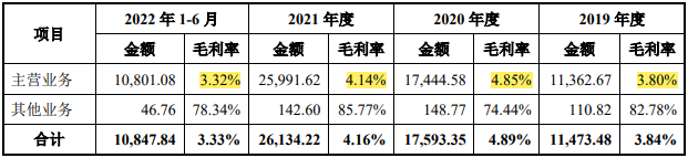 从上表标黄的主营业务毛利率数据我们可以看到,发行人的毛利率居然只有3.32%-4.85%。请大家注意的是这是毛利率而不是净利率,即使这是净利率也都很低。但现在它居然是发行人的毛利率,起初估值之家也是不敢相信自己眼睛的,但它的确就是如此。