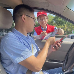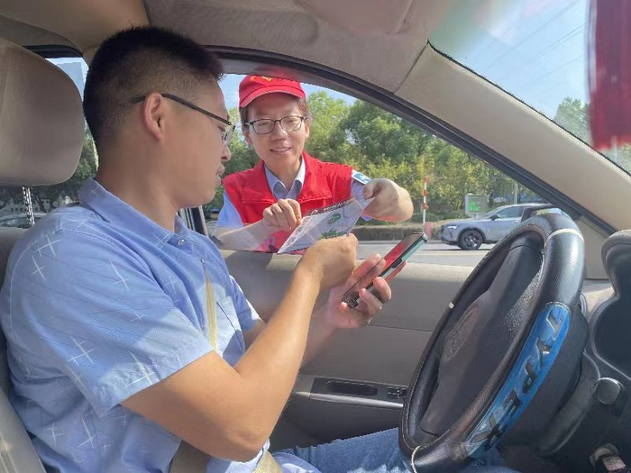 在相邻车道,小轿车驾驶员探出头向收费员问询:“听说在你们这里下高速的车辆可以享受酒店折扣优惠?”正在一旁的党员志愿者倪剑锋立即笑脸相迎,将车辆引导出车道后向驾驶员详细介绍起浙江交通集团“智在行”小程序应用及相关产品使用方法。