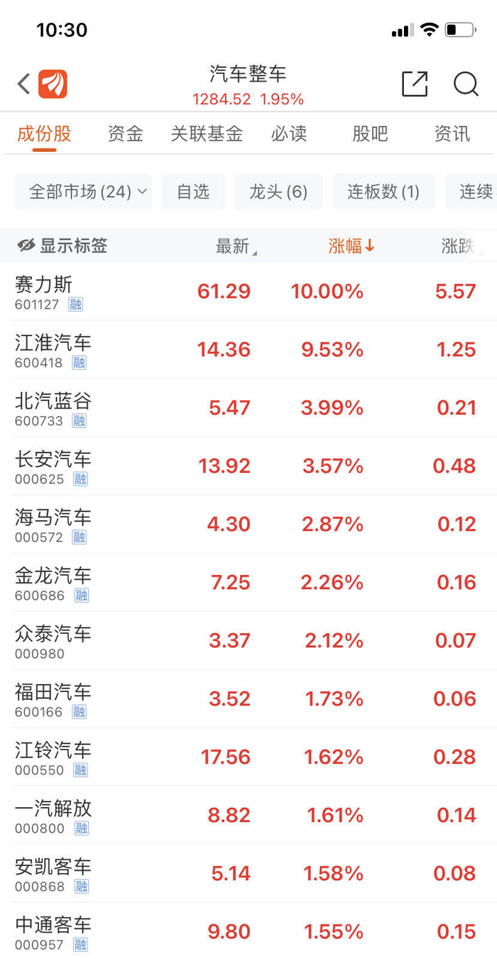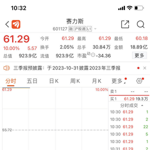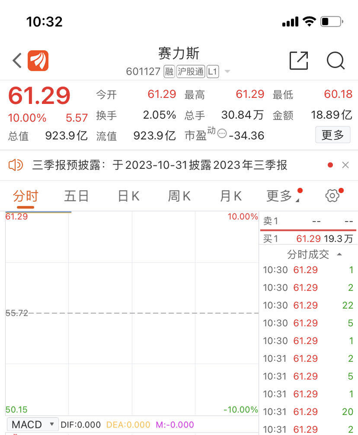 10月9日,赛力斯(SH601127)再次暴力涨停。截至发稿,赛力斯涨10%涨停,暂报61.29元,封单超19万手(约合11.6亿元),最新市值923.9亿元。