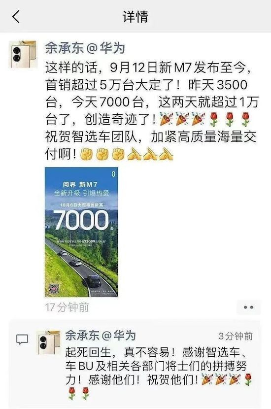 华为常务董事、终端BG CEO、智能汽车解决方案董事长余承东10月6日发了条朋友圈:9月12日新M7发布至今,首销大定超过5万辆,(10月5日、6日)问界新M7大定数量分别达到3500辆及7000辆,两天累计超过1万台。“起死回生,真不容易!”