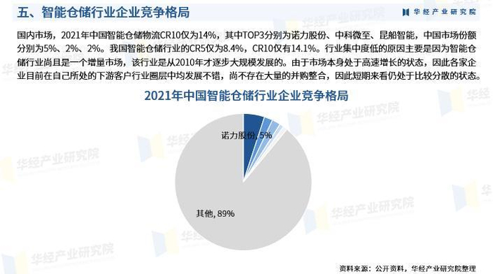 国内市场,2021年中国智能仓储物流CR10仅为14%,其中TOP3分别为诺力股份、中科微至、昆船智能,中国市场份额分别为5%、2%、2%。我国智能仓储行业的CR5仅为8.4%,CR10仅有14.1%。行业集中度低的原因主要是因为智能仓储行业尚且是一个增量市场,该行业是从2010年才逐步大规模发展的。由于市场本身处于高速增长的状态,因此各家企业目前在自己所处的下游客户行业圈层中均发展不错,尚不存在大量的并购整合,因此短期来看仍处于比较分散的状态。