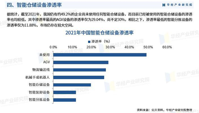 智能物流连接生产段和制造端,仓储是其中关键一环,近年来,土地和人力成本高企,仓储费用也有明显上升,智慧物流的优势进一步凸显。根据数据,2022年中国智能仓储市场规模达1237.5亿元,未来市场增速预计将加快并于25年超2000亿元。。据统计,截至2021年,我国仍有约49.2%的企业尚未使用任何智能仓储设备,而目前已经被使用的智能仓储设备的渗透率也均较低,其中渗透率最高的AGV设备的渗透率仅为29.04%,尚不足30%,相比之下,渗透率最低的智能分拣设备的渗透率仅为11.88%,市场仍存在较大空间。