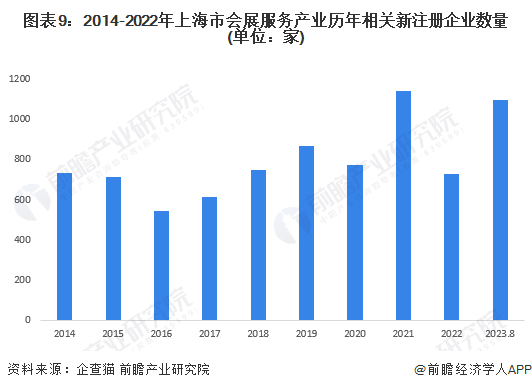 根据企查猫查询数据显示,2014年至2023年8月31日,上海市会展服务产业相关的新注册企业且存续的累计数量达到7957家,其中2021年的新增数量达到历史高峰,达1141家。2023年1-8月,上海市会展服务产业相关新注册企业数量为1094家,处于历史同期中的相对较高水平。总体来看,上海市会展服务产业相关新注册企业数量呈现波动上升趋势。