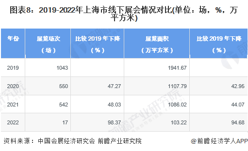 根据中国会展经济研究会披露的数据,2020-2022年受新冠疫情影响,上海市举办会展活动场次及展览面积出现大幅度下滑。2022年,上海市举办展览场次17场,展览面积共103.22万平方米,与2019年相比分别降低了98.37%和94.68%,成为疫情三年间的最低谷。根据上海市人民政府消息,2023年上半年,上海市展览面积达到759万平方米、恢复到2019年同期九成水平,会展服务业开始回暖。