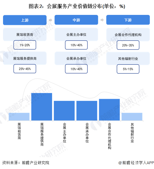 会展服务产业链的上游环节包括展馆租赁商和展馆服务提供商(如票务、翻译服务),中游环节包括会展主办单位以及会展承办单位,下游环节涵盖会展合作代理机构以及其他在会展经济发展辐射范围内的行业(如餐饮业、交通运输业)。