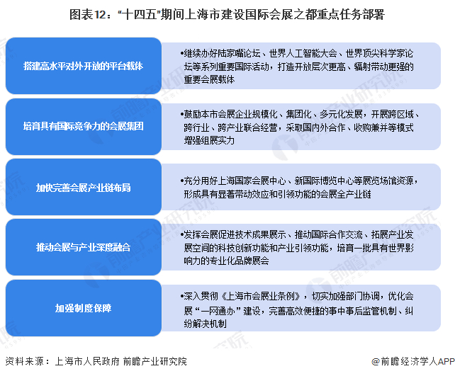 “十四五“规划期间,针对全面建成国际会展之都这一发展目标,上海市计划从以下五个方面开展工作: