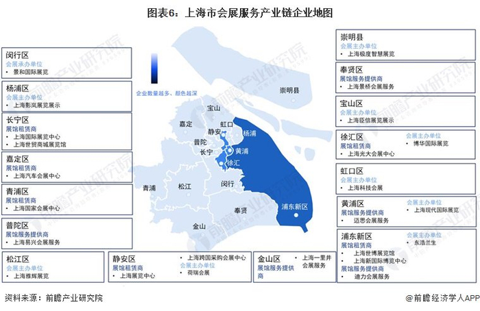 从会展服务产业链各环节的代表性企业分布地图来看,目前上海市各辖区均有相关企业分布。其中,浦东新区、黄浦区、徐汇区和静安区的分布数量相对较多。