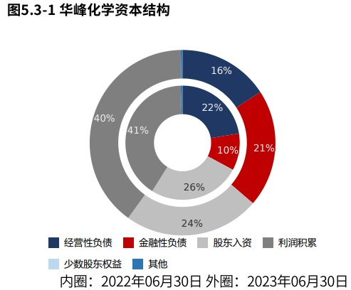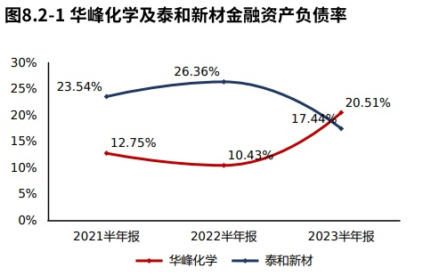 2023年06月30日华峰化学金融负债率20.51%,较2022年06月30日提高10.08个百分点,金融负债水平提高。泰和新材金融负债率17.44%,华峰化学金融负债水平高于泰和新材。华峰化学金融负债水平较高,但主要为非必要融资,其产生的财务费用将对公司效益产生不必要的冲击。