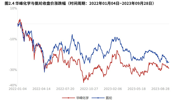 2022年01月04日到2023年09月28日,公司收盘价涨跌幅-29.05%, 沪深300 指数涨跌幅-24.98%,氨纶涨跌幅-24.95%。