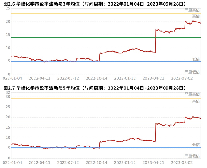 华峰化学2023年09月28日市值为350.85亿元,在3家氨纶行业上市公司中排名第1。市盈率为19.41,在3家上市公司中排名第2。公司近1年估值中枢12.18倍,目前市盈率远高于1年估值中枢。