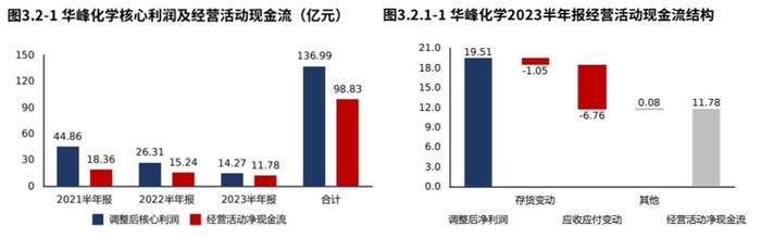 华峰化学2023半年报经营活动调整后盈利19.51亿元,提前备货导致现金流出1.05亿元,应收应付变动导致现金流出6.76亿元,其他因素导致现金流入762.64万元,最终经营活动实现现金净流入11.78亿元。