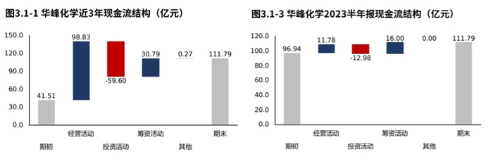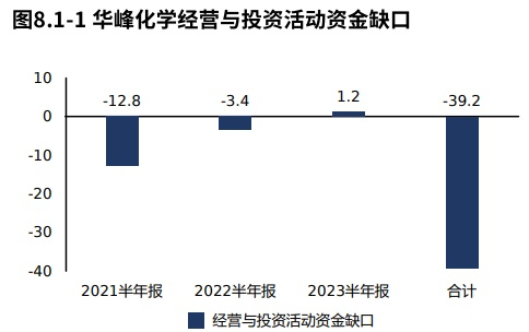 2023半年报华峰化学经营活动与投资活动资金缺口1.20亿元,较2022半年报开始出现资金缺口。2021年报到本期经营活动与投资活动累计资金净流入39.22亿元,无资金缺口。