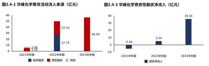 华峰化学2023半年报筹资活动现金流入56.20亿元,较2022半年报增加6.13亿元,增速12.25%,筹资活动现金流入有所增加。华峰化学2023半年报筹资流入全部来源于债权。