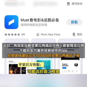 【#苹果商店仍有多款黄色软件伪装后上架#,客服回应:可能没审核到将逐一排查】近日,有网友反映苹果应用商店中有一款教育类应用,下载后实为黄色视频软件的app,经媒体报道后已于10月7日在苹果应用商店下架。#苹果商店相继下架相关黄色软件#10月8日,又有多名网友反映苹果应用商店仍旧存在多款伪装成其他类型但实为黄色视频软件的app,扬子晚报紫牛新闻记者陆续下载其中两款后发现网友反映情况属实。10月9日,记者再次检索苹果应用商店发现,其中部分涉黄软件已经下架。苹果官方客服回应记者表示,或因工程部未能完全审核到所致,将对软件进行逐一排查。10月8日,有网友反映,苹果应用商店还有多款伪装成其他类型但实为黄色视频软件的app,其中包括一款骑行类应用、一款工具类应用和一款报刊杂志类应用。记者检索该骑行类软件发现,苹果应用商店已检索不到此软件,记者又搜索了一款测算身高、体重的工具类应用,下载后打开发现确实如网友所说里面是黄色视频内容,与此前报道的伪装成教育类学习软件但实为黄色视频软件界面一致。随后记者又下载了网友所说的第三款报刊杂志类应用,打开后发现里面同样充斥着大量黄色视频,但在该应用的详情介绍页面中显示,年龄分级为4岁以上,类别为报刊杂志,有51位用户为该软件打分,均分为3.9分。10月9日,记者再次在苹果应用商店检索上述两款软件发现,其中伪装成测算身高、体重的工具类软件实为黄色应用的app已被下架,商店内已搜索不到。而另一款伪装成报刊杂志类实为黄色软件的app仍能搜索到,并可被下载。9日下午,扬子晚报紫牛新闻记者致电苹果官方客服,工作人员表示,目前已接到很多关于黄色软件伪装成其他类型应用在苹果应用商店上架下载的情况,“我们的工程部也在进行调查,后续如果有进展的话会给予回复。”对于发生这种情况的原因,工作人员告诉记者,“可能是工程部有些审核没有完全审核到,产生了一些漏网之鱼,后面我们会对这些软件进行逐一排查,肯定会给广大用户一个满意的答复,后续我们官网会对此事发布相关公告。”(扬子晚报/紫牛新闻记者徐韶达视频剪辑:周嘉楠)