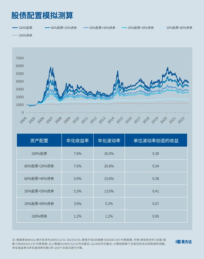 我们用沪深300指数代表股票,中债-新综合全价(总值)指数代表债券,模拟在2004年12月31日-2023年6月30日期间,股债配比分别为20/80、50/50、60/40、80/20四个组合的表现。