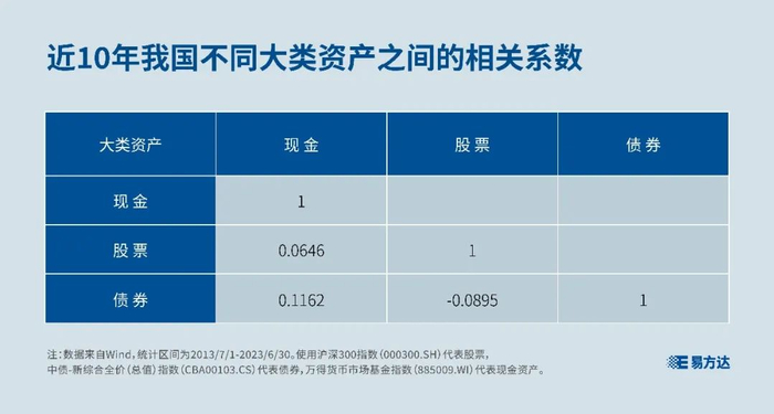 我们以沪深300指数(000300.SH)代表股票,中债-新综合全价(总值)指数(CBA00103.CS)代表债券,万得货币市场基金指数(885009.WI)代表现金资产。截至2023年6月30日,近10年来现金及现金等价物的波动非常小,与债券和股票的相关性都很低;而股票和债券之间的相关系数为-0.0895,呈微弱的负相关。