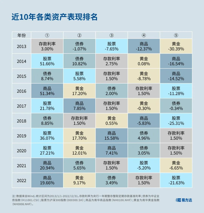 但美林时钟不是万能的,在实际投资中,想要做出准确的判断并不简单。从下图可以看到,过去10年,股票、债券、商品等各类资产涨跌不一。