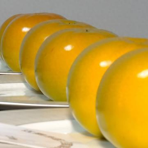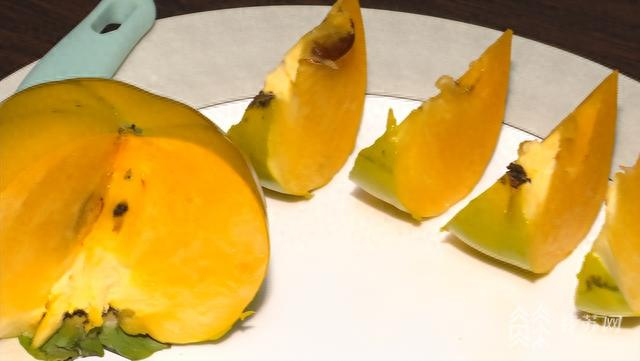 乍看外表,太秋甜柿没什么特别之处,捏一捏,却十分坚硬。用刀切开,果肉橙黄,有一股哈密瓜的清香。南京农业大学杮研究团队博士生曹丽芳介绍,“它成熟之后肉质是硬的,不需要像普通柿子一样,放软才可以食用。它不仅营养丰富,而且口感非常酥脆,吃起来像苹果一样,汁水就像梨一样很饱满。”