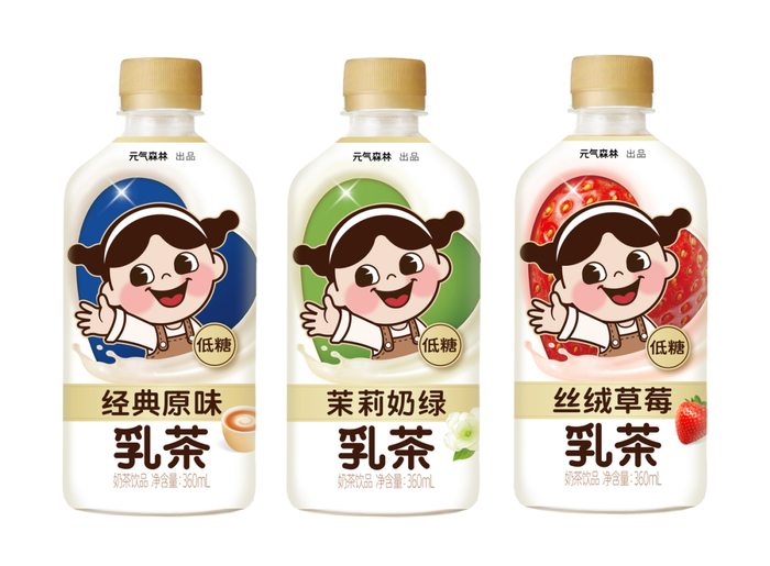 元气森林的瓶装乳茶产品也在今年9月完成了更新,在保持了低糖卖点的同时,有“经典原味”“茉莉奶绿”“丝绒草莓”3种口味,360ml单瓶售价在6元左右。