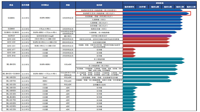 百利天恒2023半年报显示,SI-B001正在国内开展针对非小细胞肺癌、头颈鳞癌、食管癌、消化道肿瘤等多个适应症在内的临床研究,其中,针对“EGFR野生型非小细胞肺癌(联合治疗)”的研究已经进入临床III期,是该药物进度最快的一项在研适应症,同时也是百利天恒所有创新生物类产品的适应症之中,唯一进入临床III期的一项。